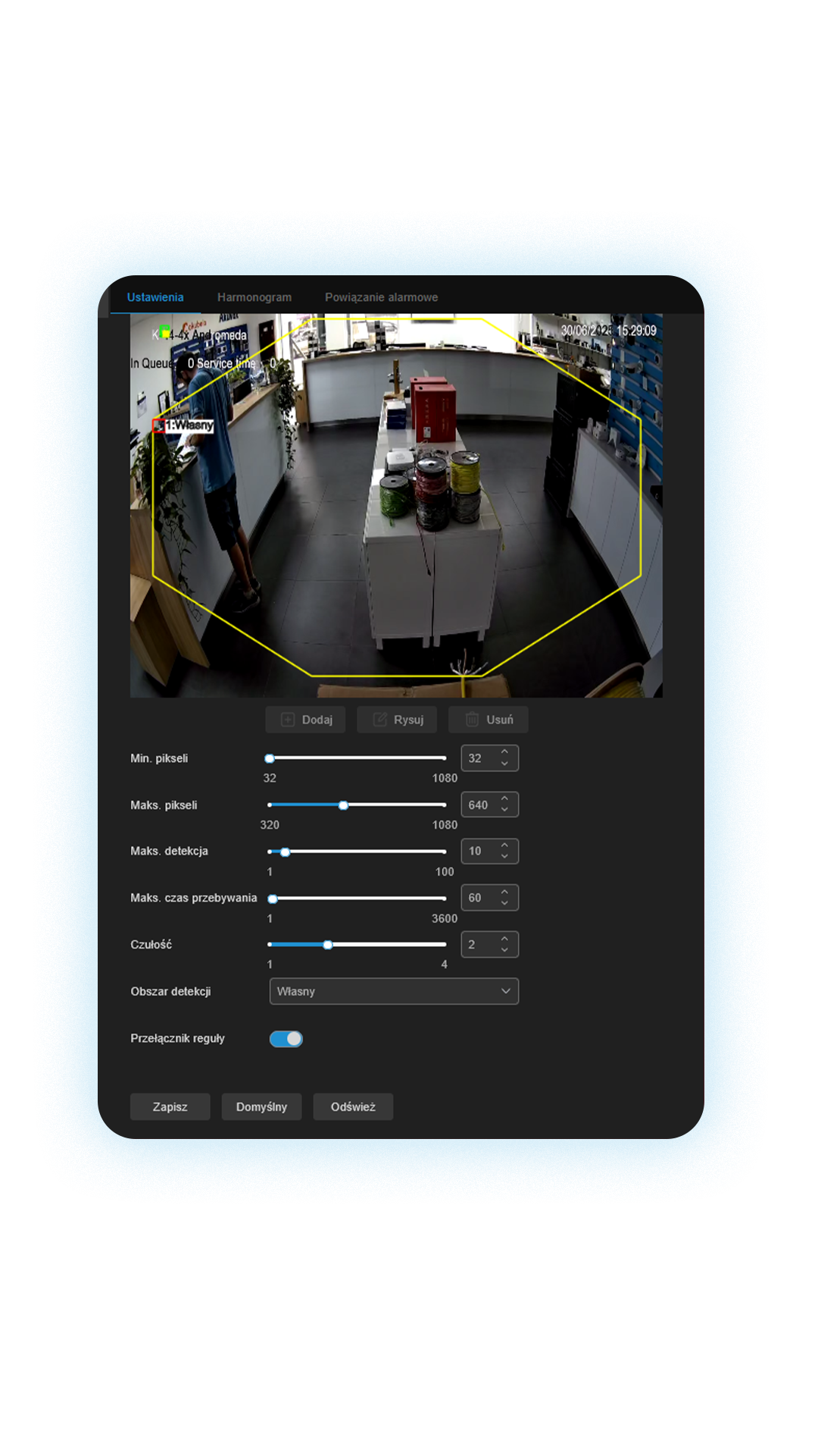 Wyobraź sobie, że Twoja kamera nie tylko nagrywa obraz, ale też liczy osoby stojące w kolejce i mierzy czas oczekiwania. W praktyce działa to jak cyfrowy asystent, który cały czas śledzi, ile osób ustawiło się przy kasie, okienku, punkcie odbioru – i od razu reaguje, gdy robi się tłoczno.