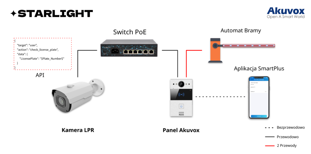 Integracja jest możliwa dla wybranych paneli Akuvox współpracujących z chmurą SmartPlus (https://knowledge.akuvox.com/docs/integration-with-milesight-lpr-camera-for-door-opening). System wymaga jedynie, aby wideodomofon Akuvox (np. R20A) i kamera LPR Starlight znajdowały się w tej samej sieci LAN.
