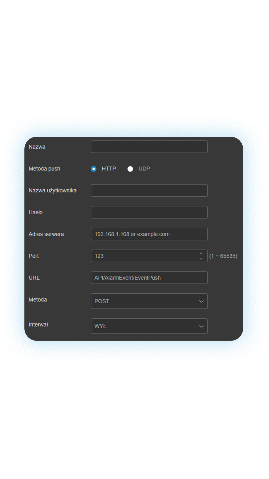 Masz własny system alarmowy, aplikację lub serwer? Wystarczy podać jego adres URL i metoda (POST/GET), login i hasło. Kamera automatycznie wyśle komunikat, np. na /API/AlarmEvent/EventPush, kiedy wykryje zdarzenie. Możesz zintegrować swój monitoring z dowolną platformą – tak, jak potrzebujesz.