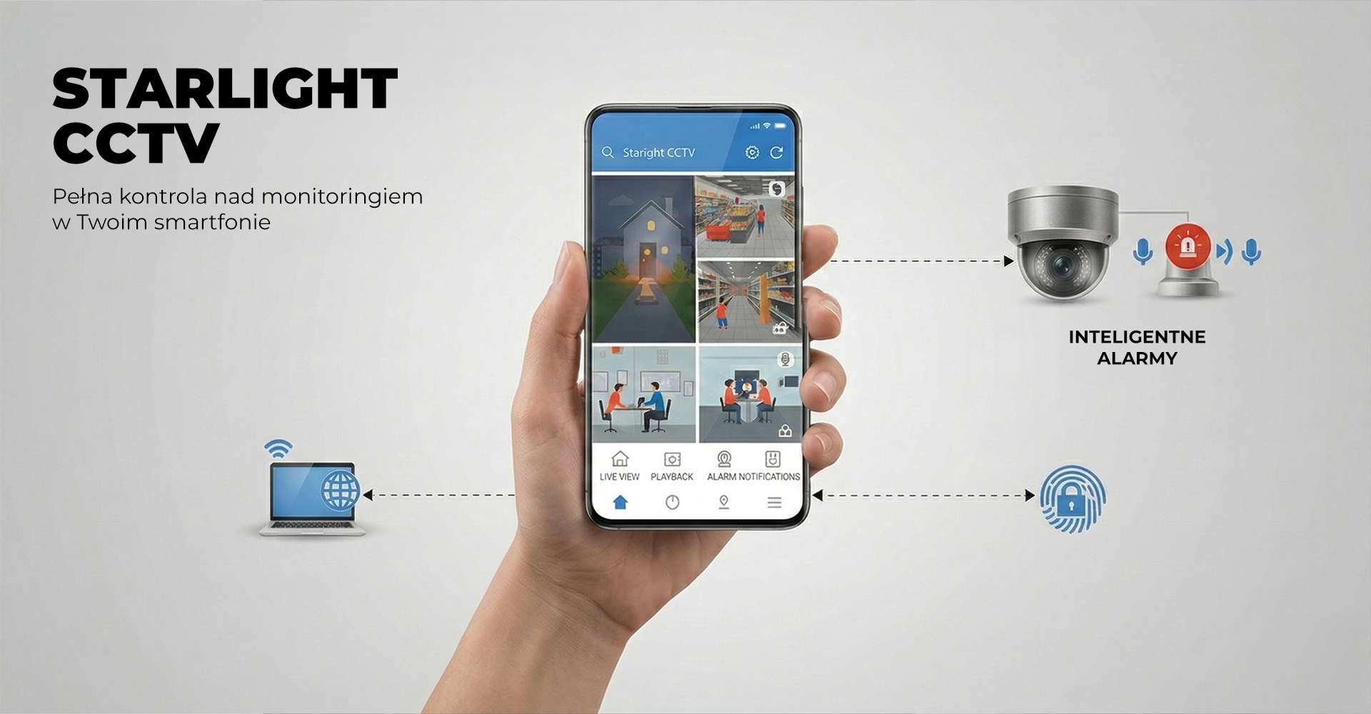 Zarządzaj bezpieczeństwem swojej posesji, biura czy sklepu z dowolnego miejsca na świecie dzięki aplikacji Starlight CCTV. To mobilne centrum dowodzenia Twojego systemu monitoringu – intuicyjne, stabilne i nowoczesne.