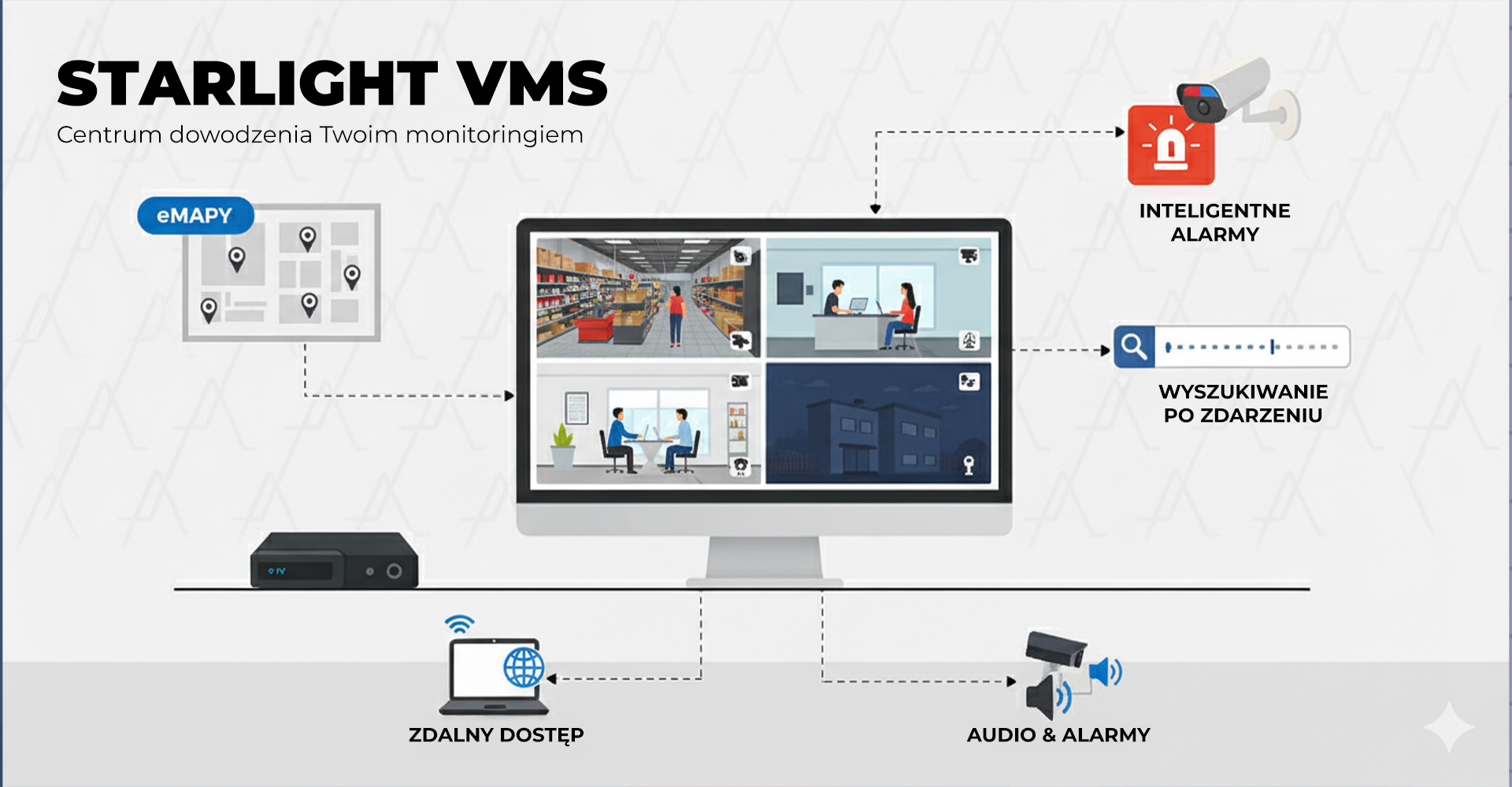 Wyobraź sobie, że zarządzasz wszystkimi kamerami, rejestratorami i alarmami z jednego miejsca – bez względu na to, czy są rozmieszczone w jednym biurze, czy na kilkunastu odległych obiektach. Starlight VMS to profesjonalne oprogramowanie do zarządzania systemami monitoringu IP, które daje Ci pełną kontrolę, podgląd na żywo, inteligentne alarmy, dostęp do nagrań i zaawansowane funkcje AI – wszystko z poziomu jednej, intuicyjnej aplikacji.